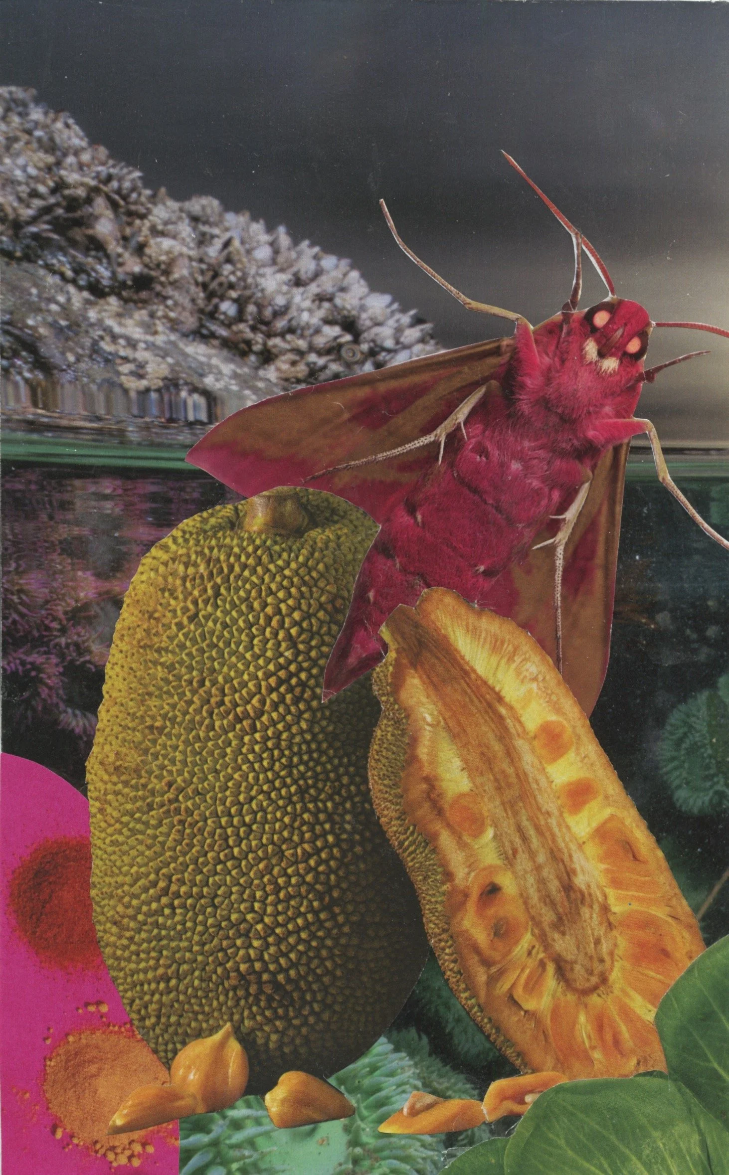 © Genevieve Camp, Still Life with Jackfruit and fuchsia moth, magazine collage, 5” x 8”